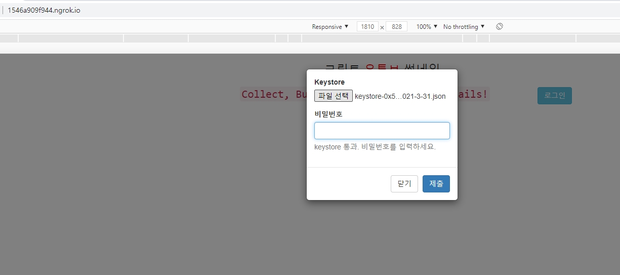 <div class="modal fade" tabindex="-1" role="dialog" id="loginModal"> <div class="modal-dialog modal-sm"> <div class="modal-content"> <div class="modal-body"> <div class="form-group"> <label for="keystore">Keystore</label> <input type="file" id="keystore" onchange="App.handleImport()"> </div> <div class="form-group"> <label for="input-password">비밀번호</label> <input type="password" class="form-control" id="input-password" onchange="App.handlePassword()"> <p class="help-block" id="message"></p> </div> </div> <div class="modal-footer"> <button type="button" class="btn btn-default" data-dismiss="modal">닫기</button> <button type="button" class="btn btn-primary" onclick="App.handleLogin()">제출</button> </div> </div><!-- /.modal-content --> </div><!-- /.modal-dialog --> </div><!-- /.modal --> </body>